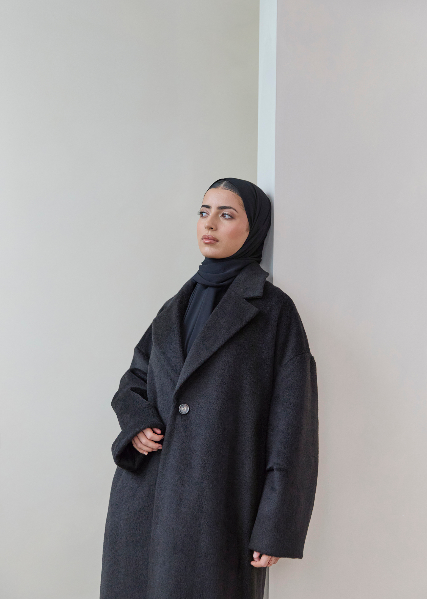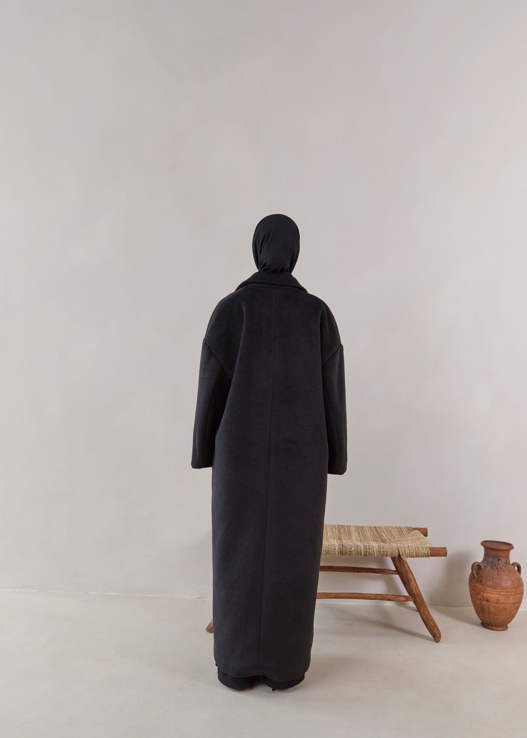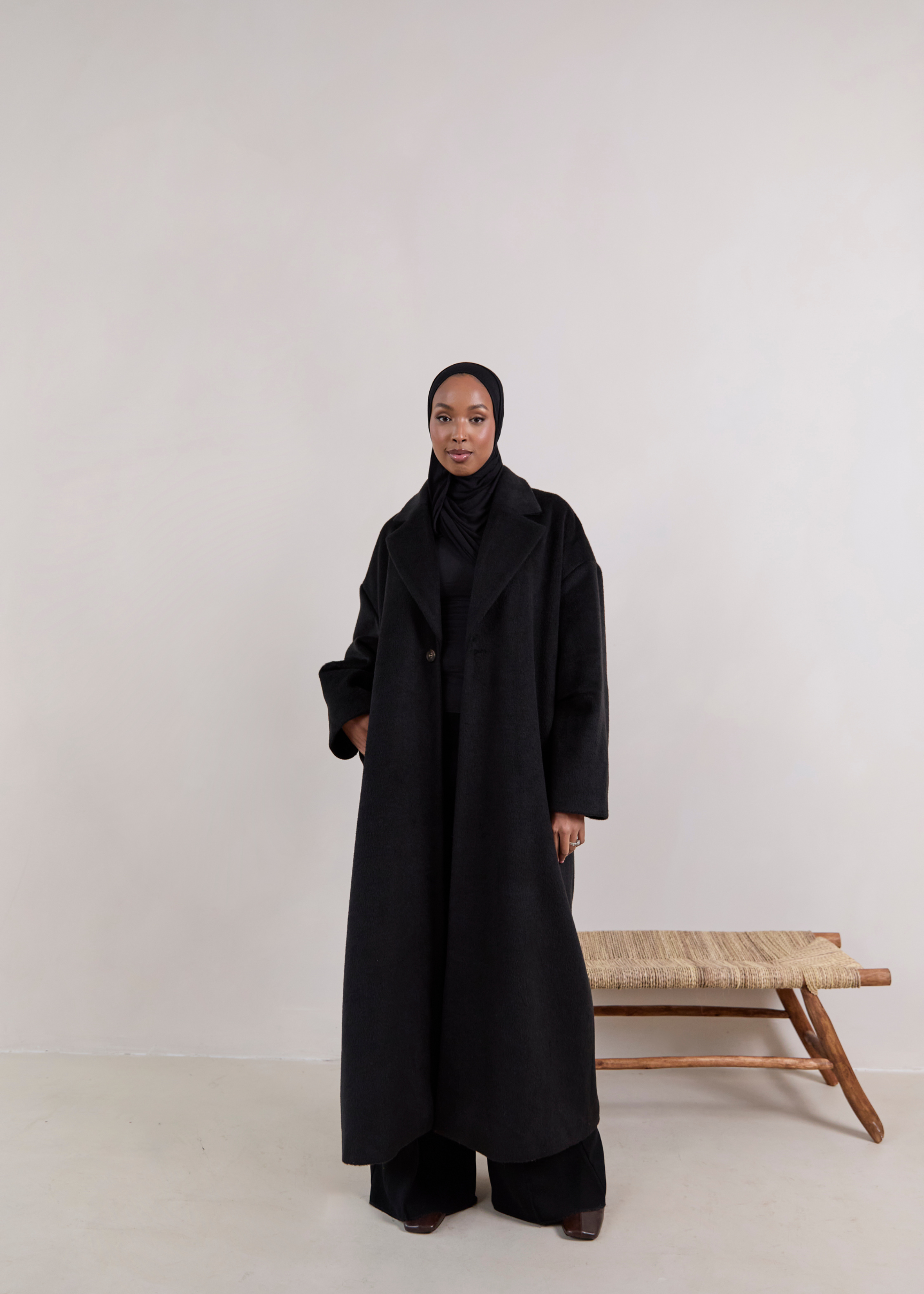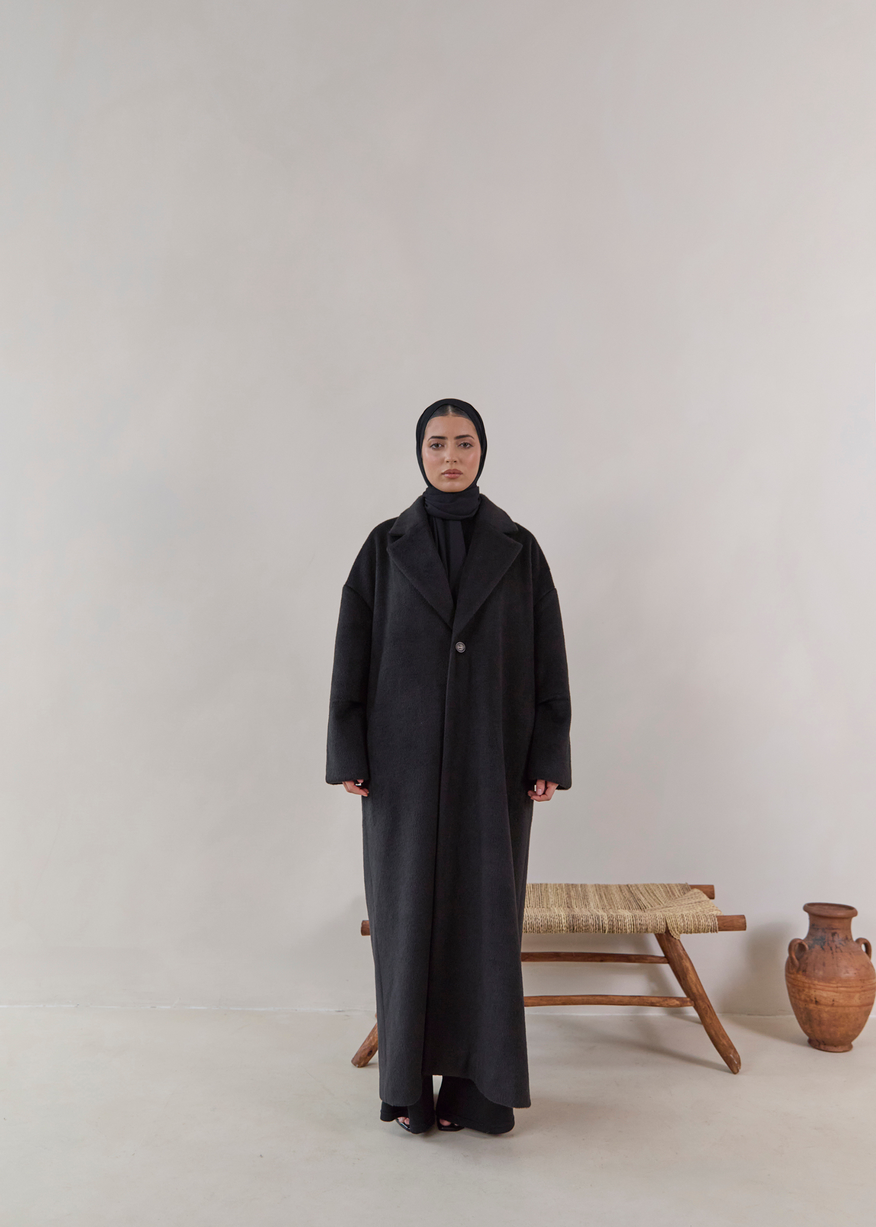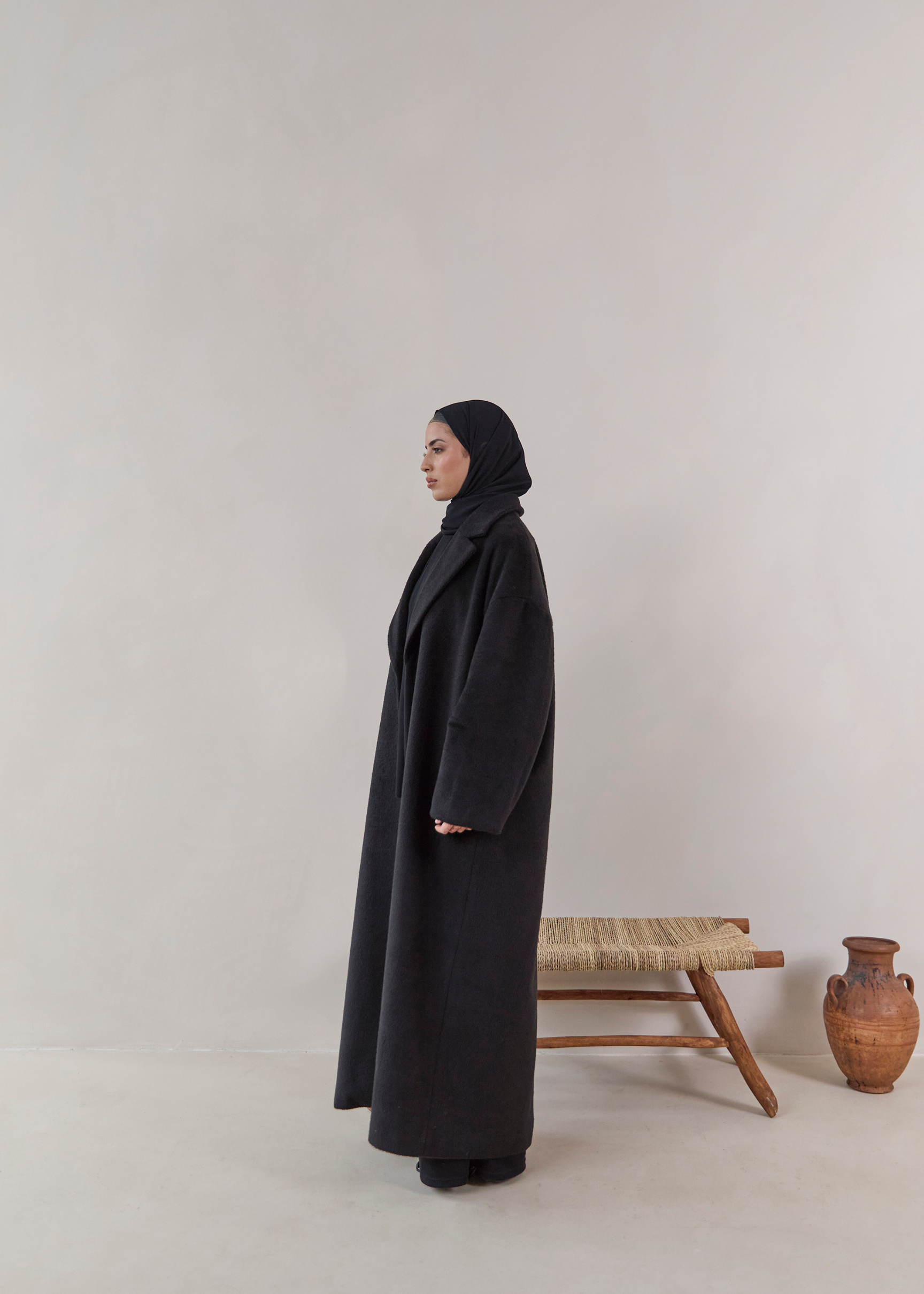 Crafted from a soft wool-blend fabric, the Midnight Noir Abaya Coat features a classic collar, a sleek button closure, and discreet hidden pockets for practicality. The flowing silhouette and deep black hue exude elegance and versatility, making it perfect for layering over any outfit.