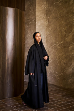 Minimalism at its finest. The Closed Abaya in Opium Black defines quiet luxury through simplicity. Its fluid drape and matte-black tone create a powerful, refined silhouette suitable for every occasion.