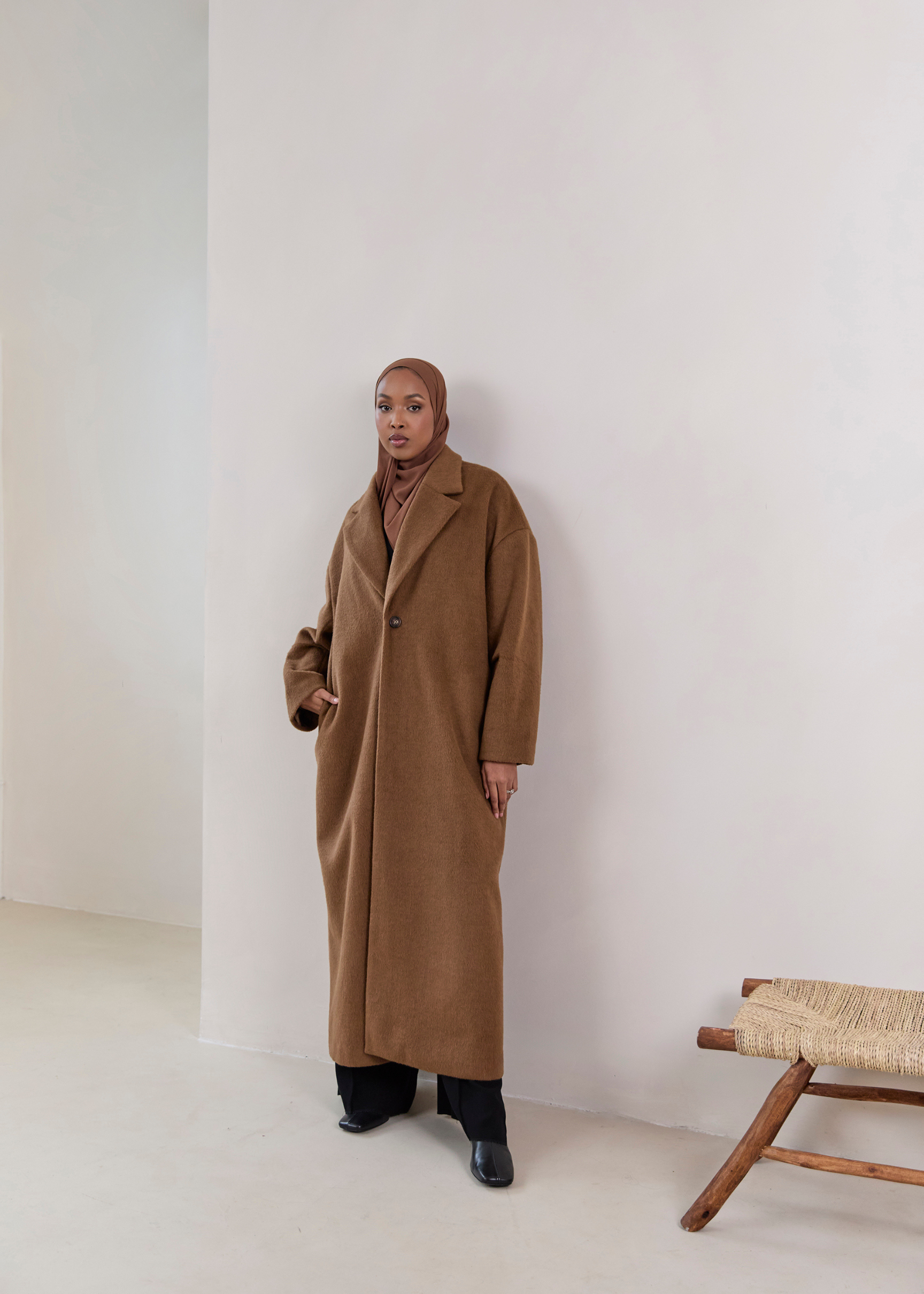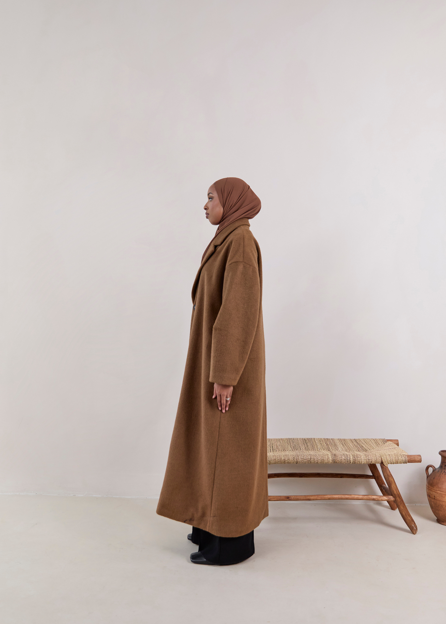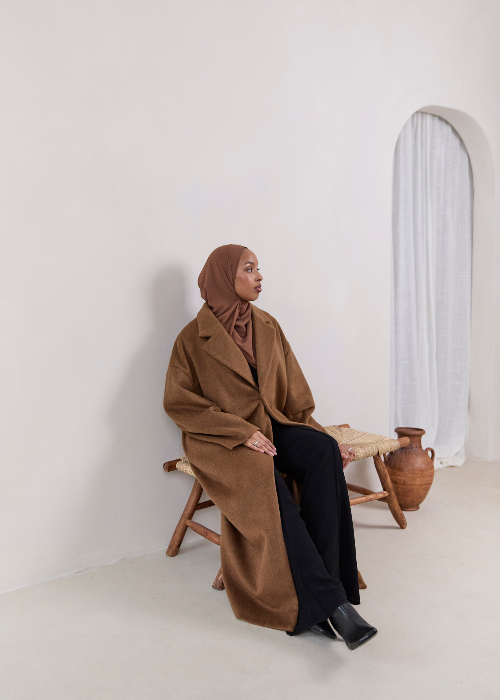 Embrace the warmth of understated luxury with our Chestnut Haze Abaya Coat, designed for the modern woman who values both comfort and style. This maxi-length coat is crafted from a soft wool-blend fabric, making it a perfect companion for cold weather while ensuring a chic and polished appearance.