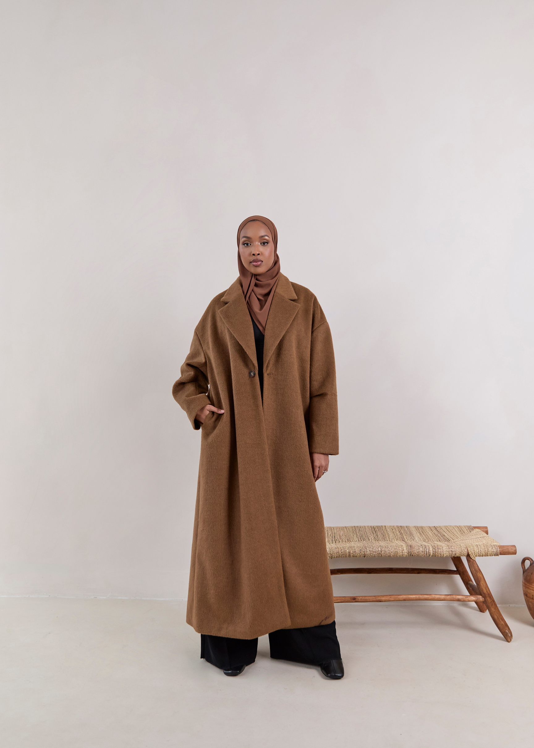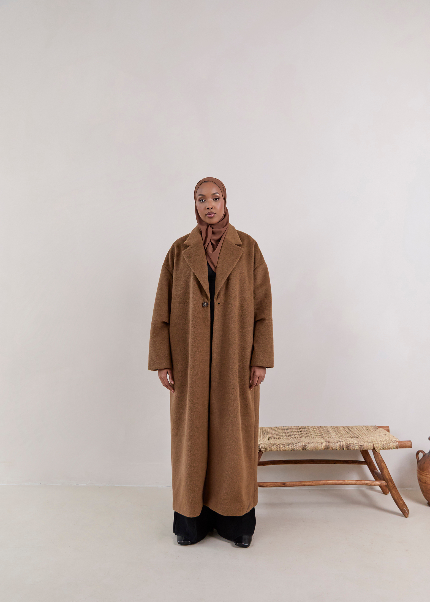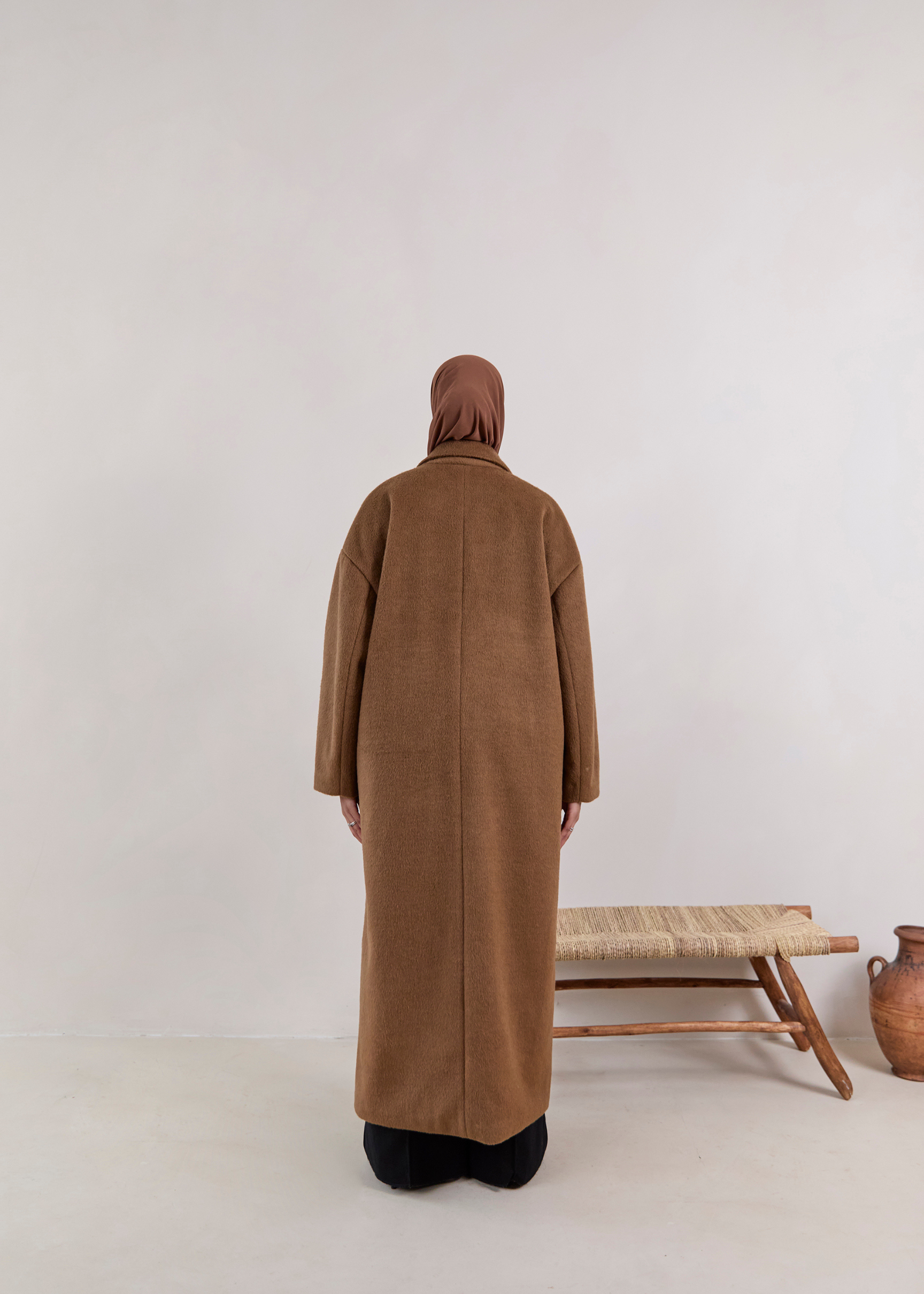 Embrace the warmth of understated luxury with our Chestnut Haze Abaya Coat, designed for the modern woman who values both comfort and style. This maxi-length coat is crafted from a soft wool-blend fabric, making it a perfect companion for cold weather while ensuring a chic and polished appearance.