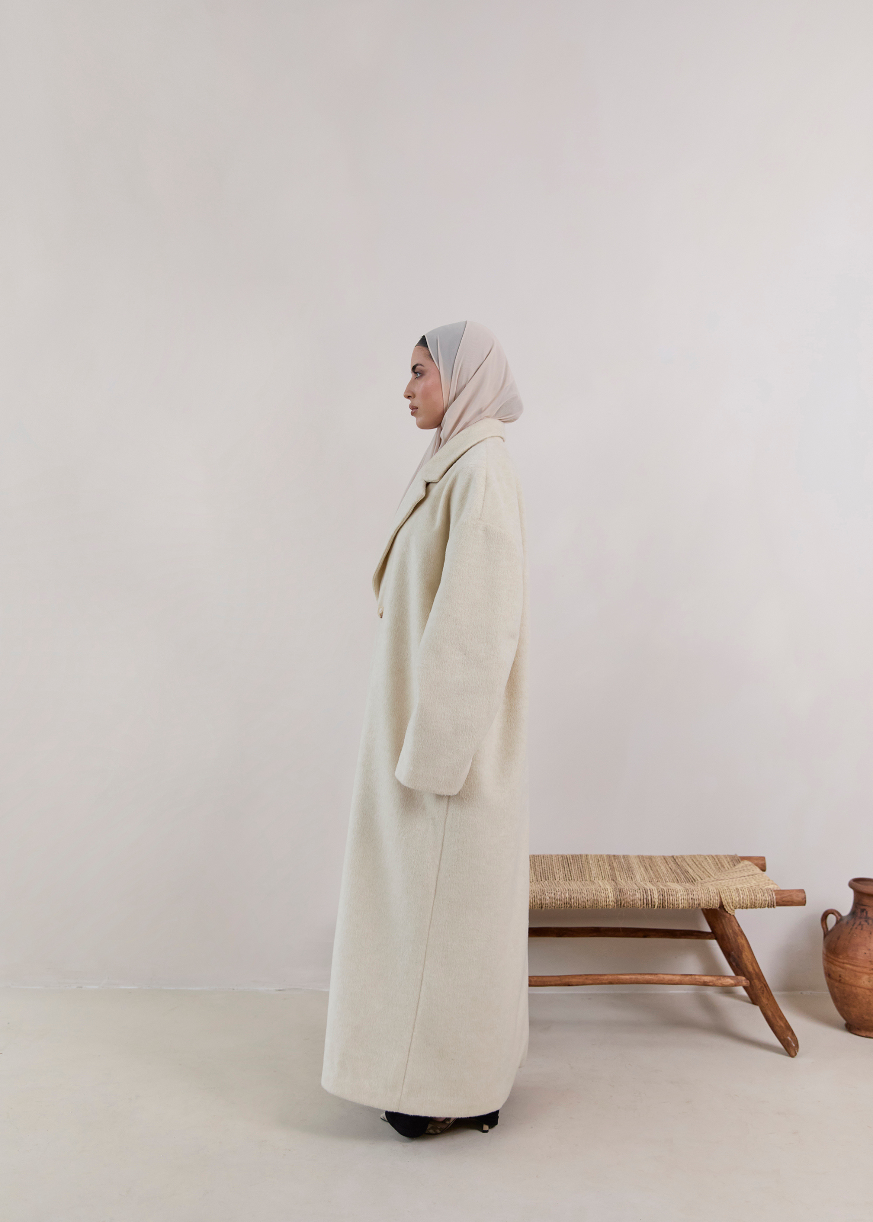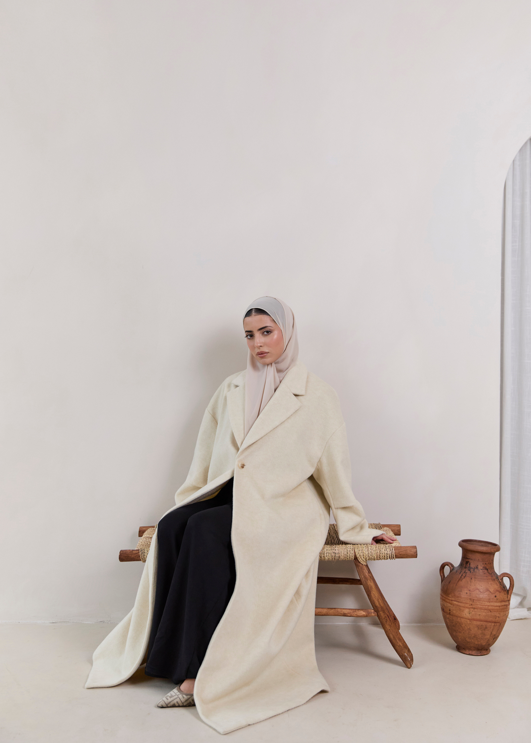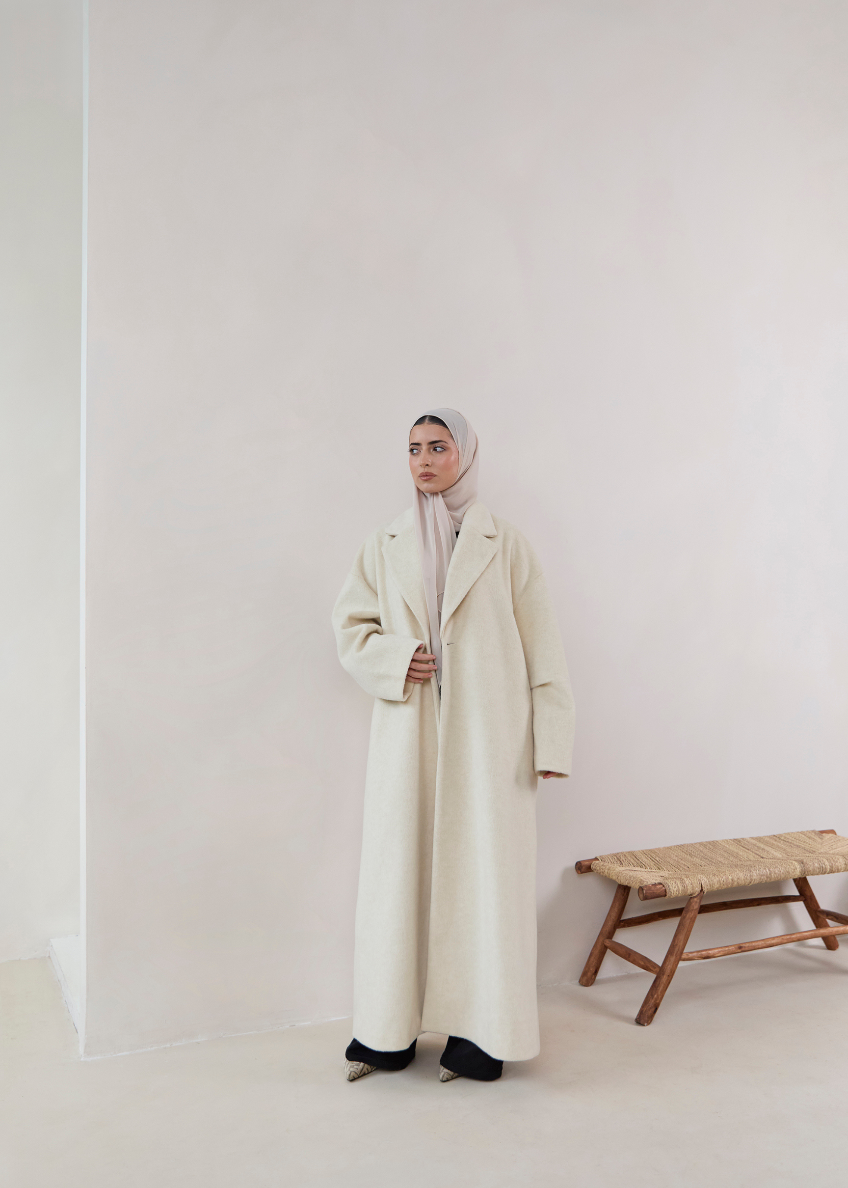 Wrap yourself in the timeless elegance of our Ivory Sand Abaya Coat, a sophisticated take on modern modest winterwear. This maxi coat is expertly designed to offer warmth, style, and practicality, making it an essential for the colder months.
