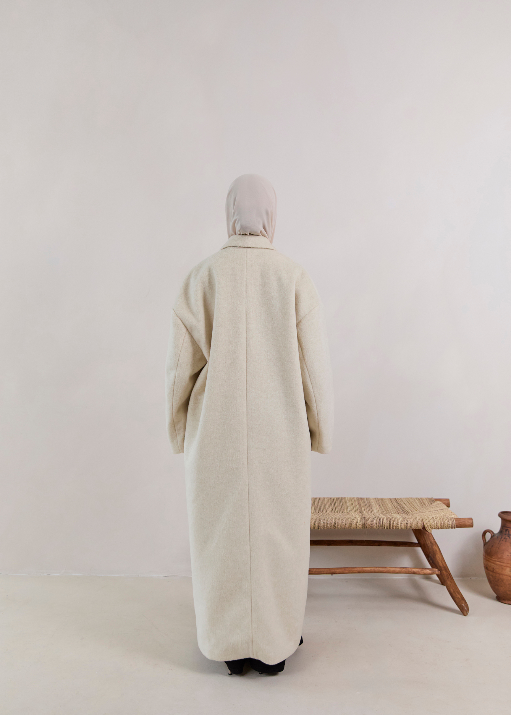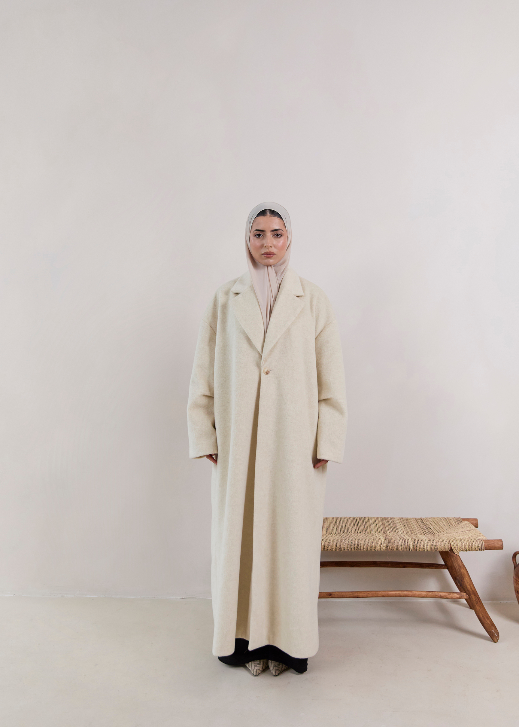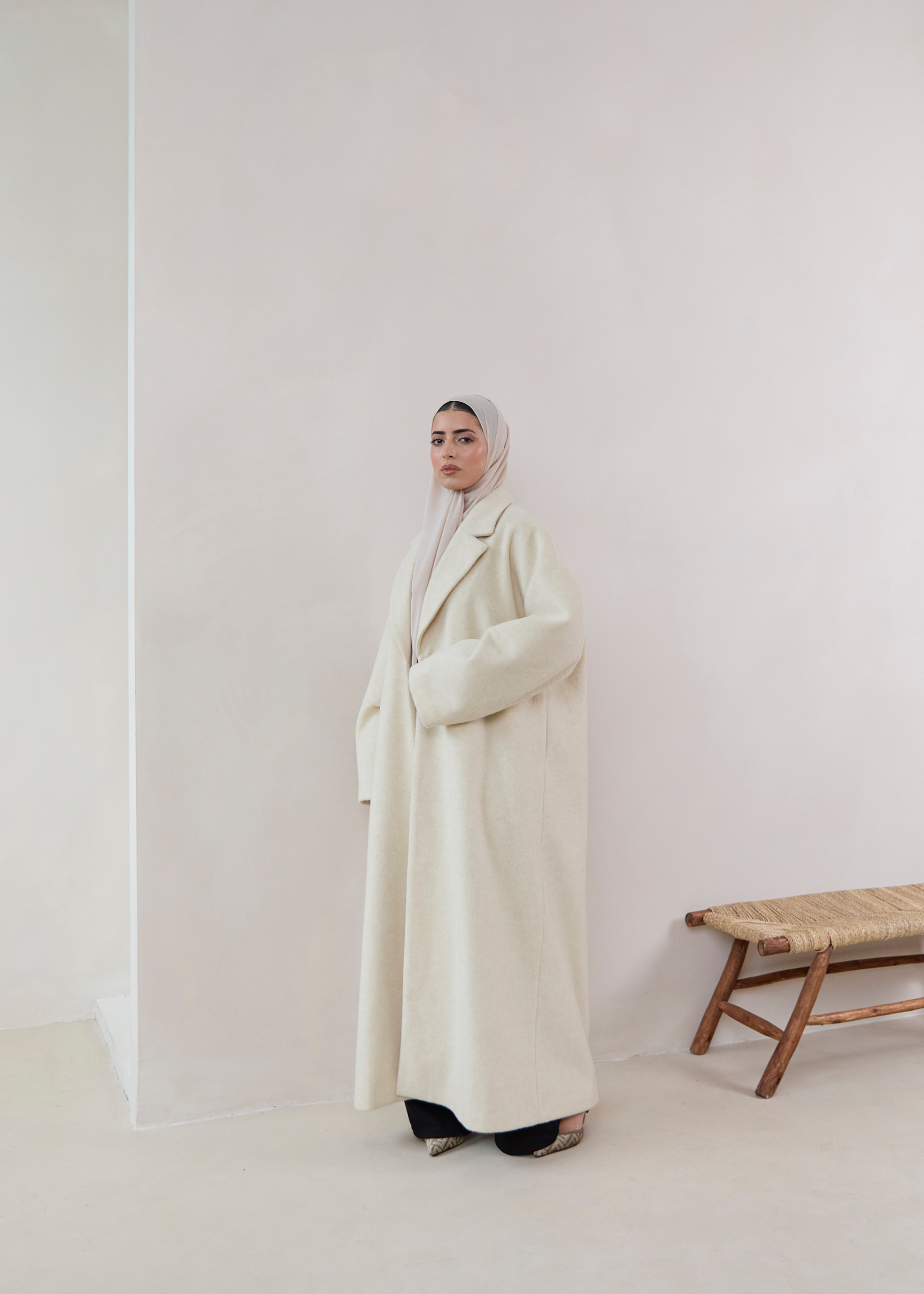 Wrap yourself in the timeless elegance of our Ivory Sand Abaya Coat, a sophisticated take on modern modest winterwear. This maxi coat is expertly designed to offer warmth, style, and practicality, making it an essential for the colder months.