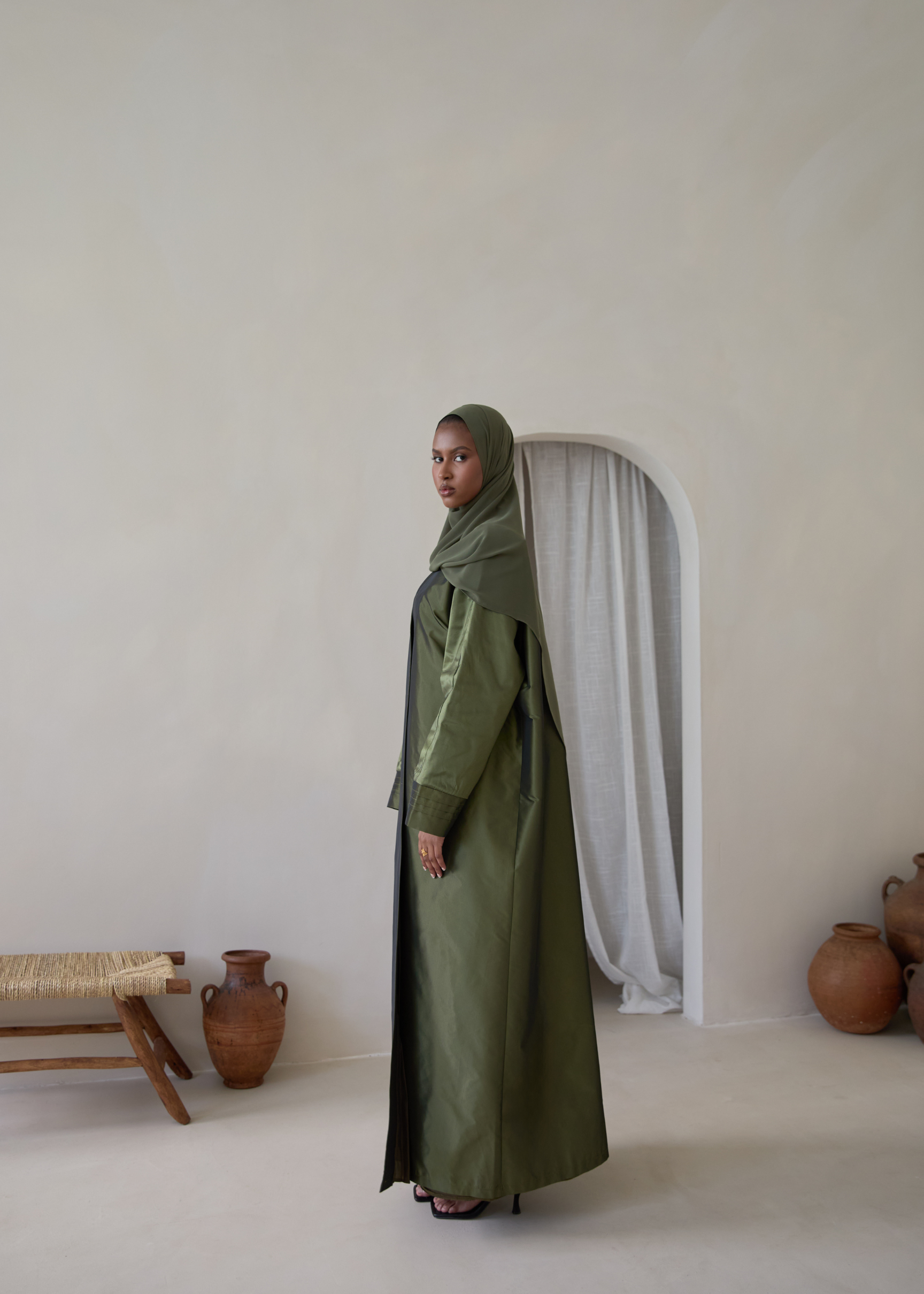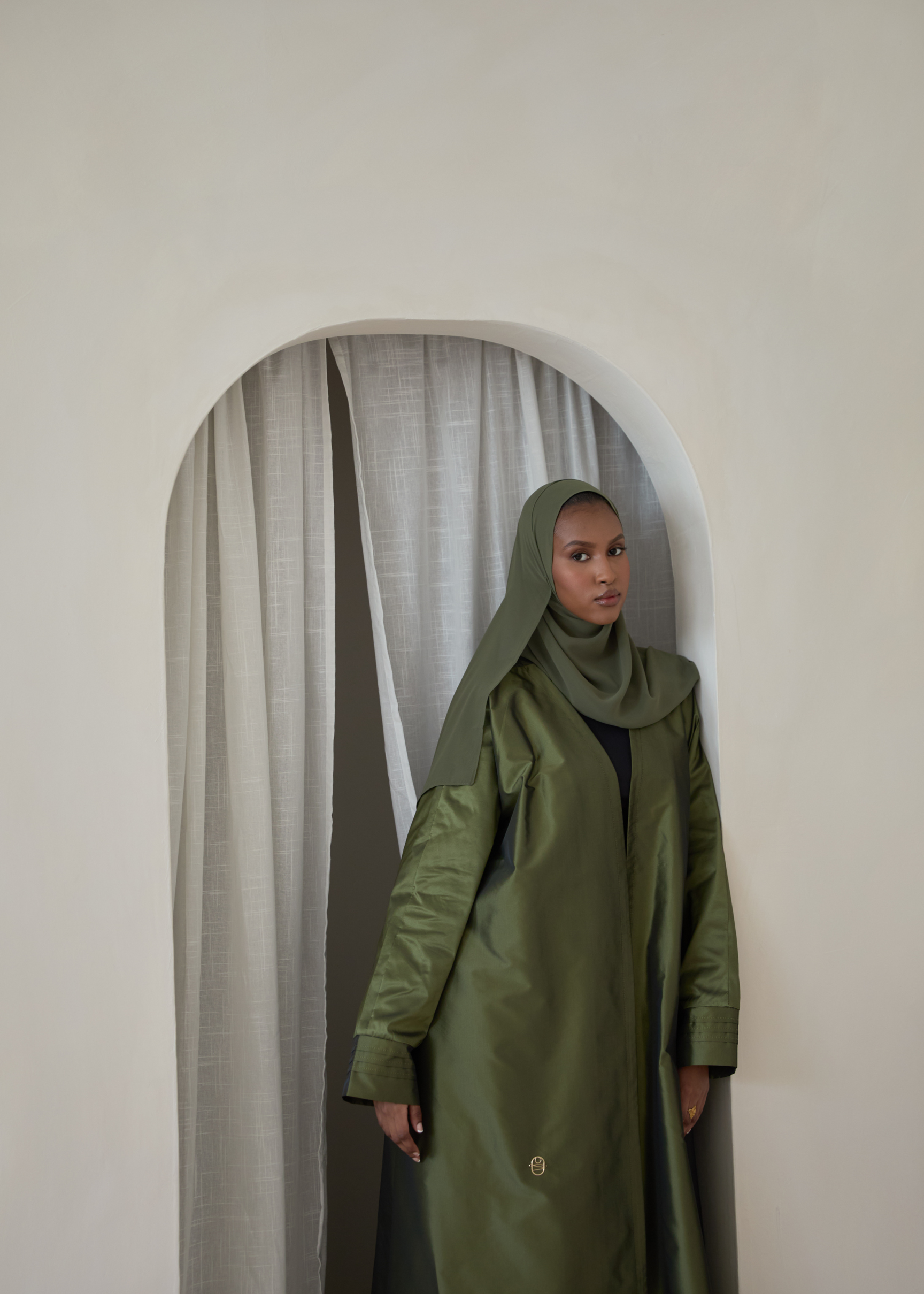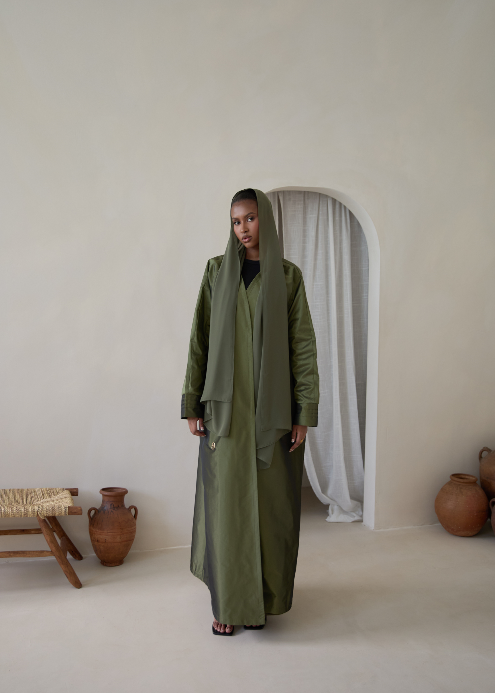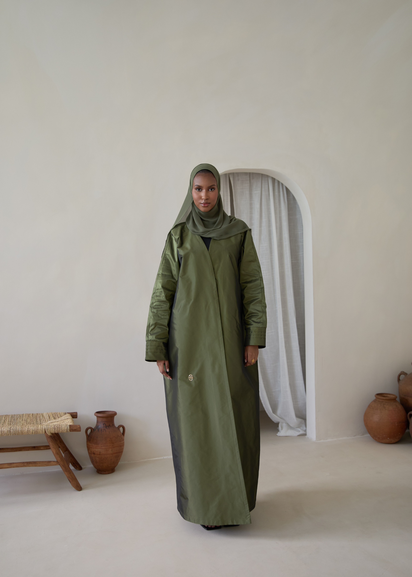 The olive drab abaya is a statement piece that your modest wardrobe needs. Made from taffeta, the firm nature of this fabric creates a royal look.
